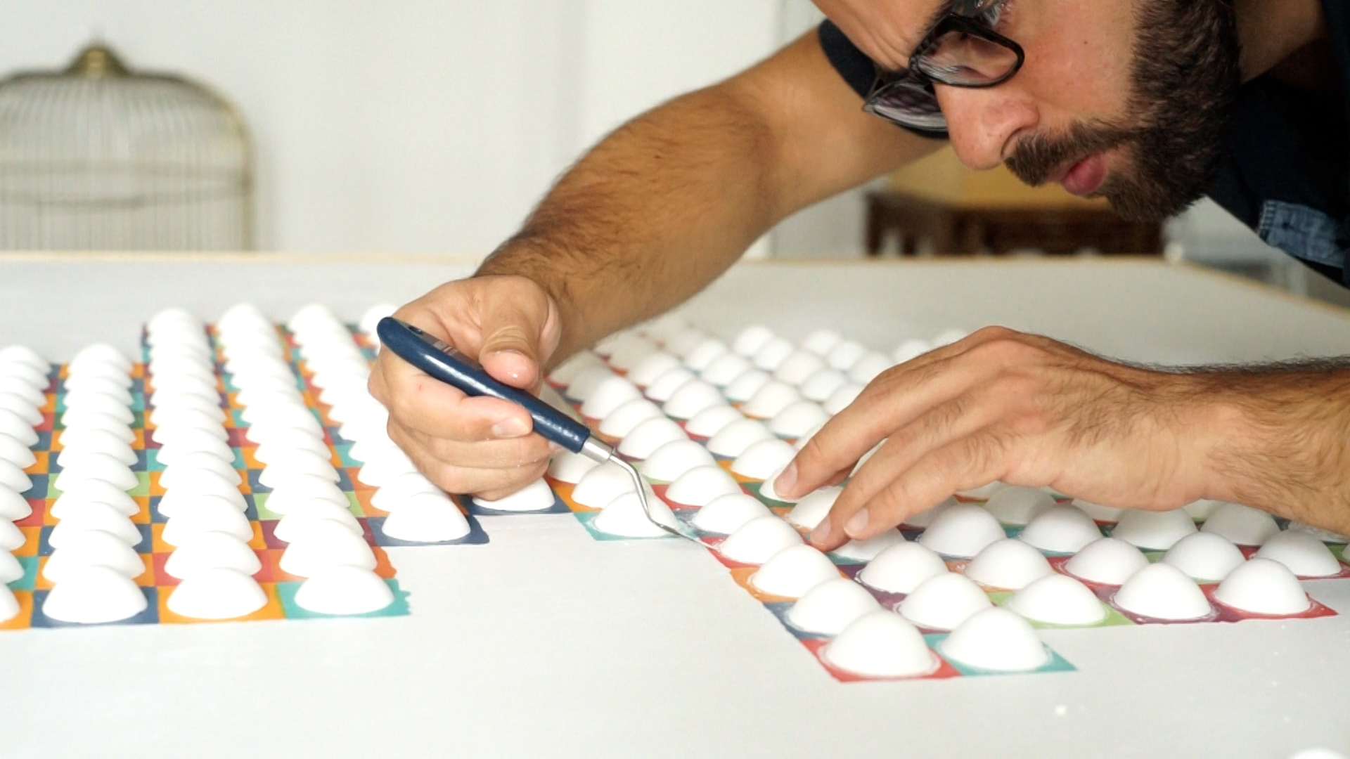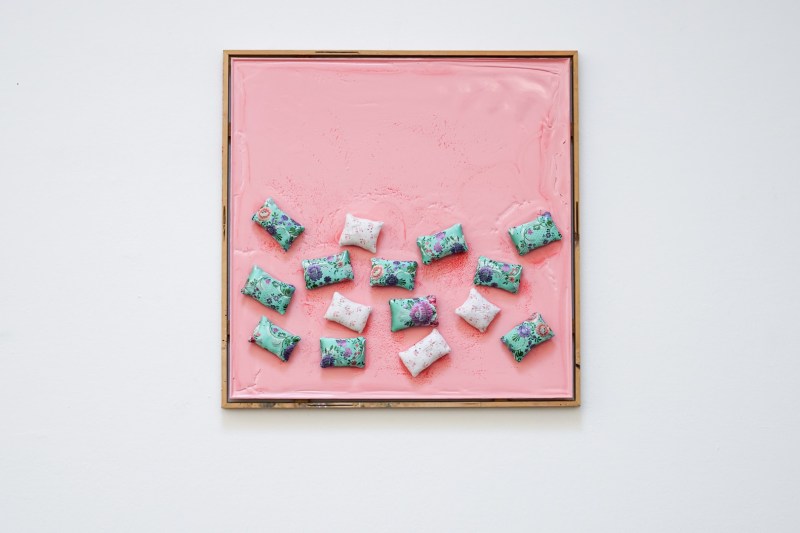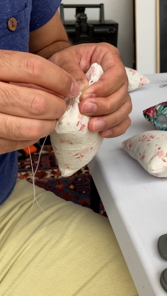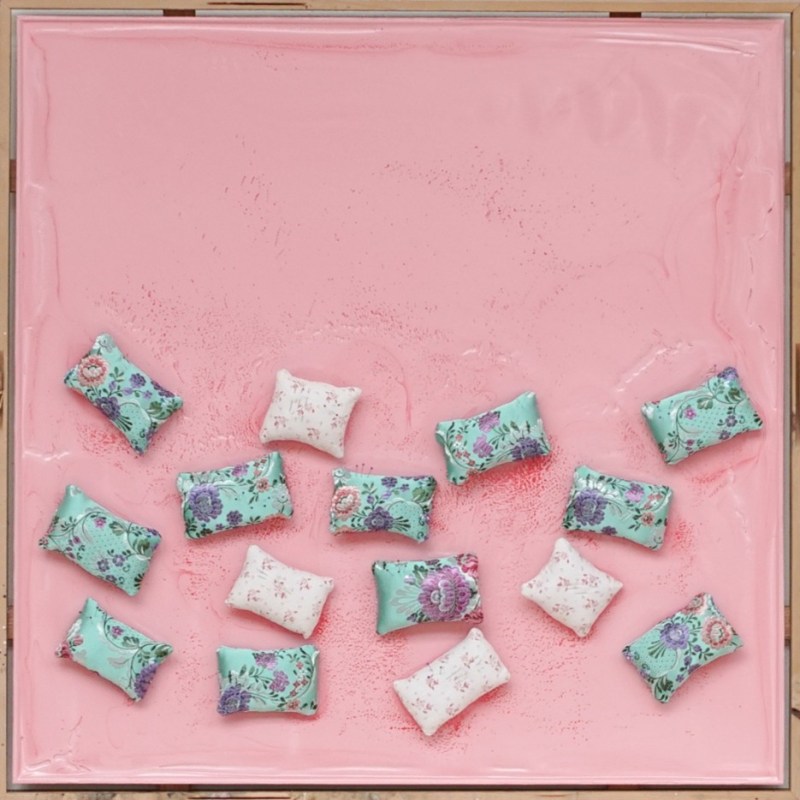 In modest households, every old garment is turned into a rag or a pincushion. In this work, Jesús Gómez uses a typical fabric from traditional Valencian dresses to sew his pincushions. This suggests a kind of parallel opulence compared to the few pincushions made from scraps taken from his family home.