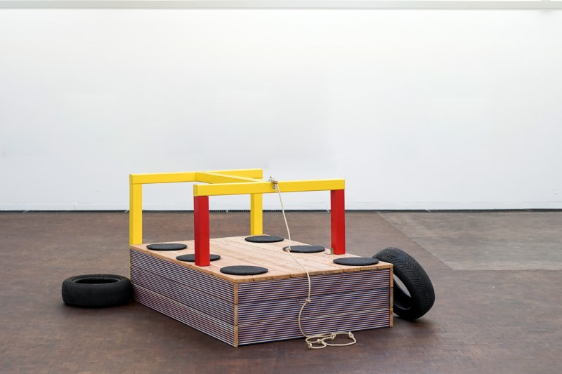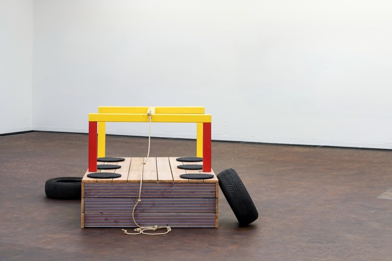 Wood, acrylic lacquer, car tires, rope and bolts