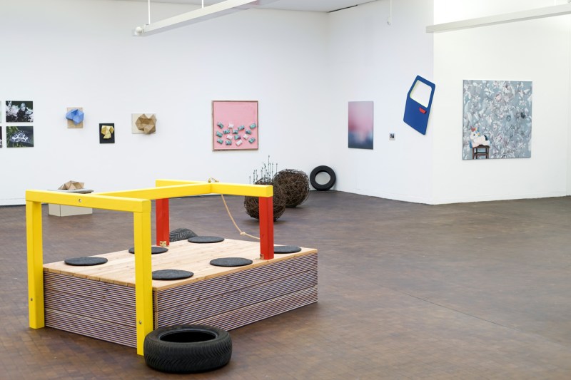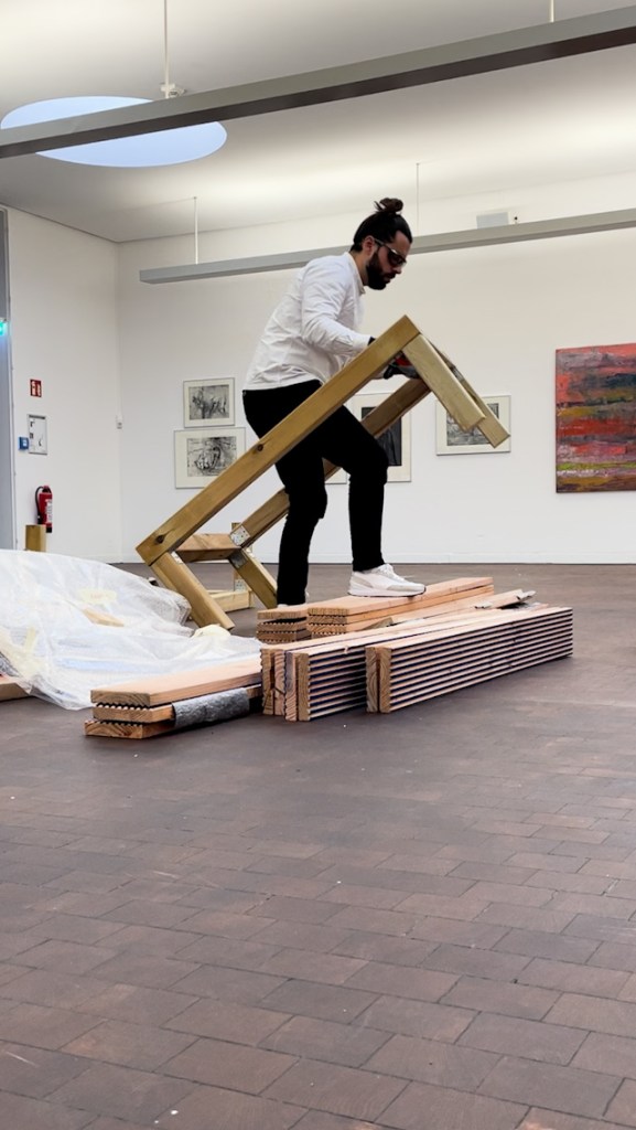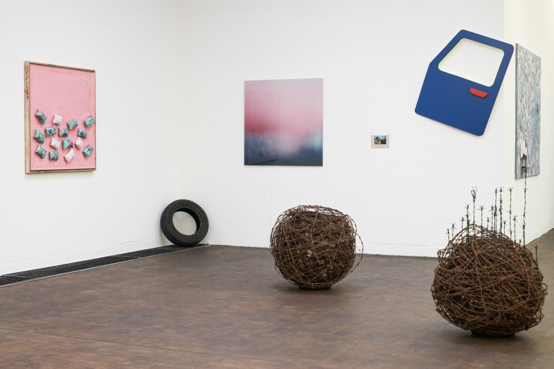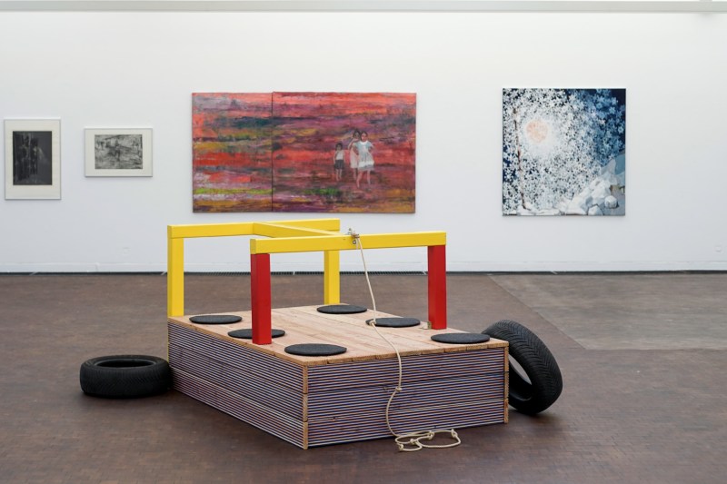 At the same time, the piece resembles the structure of a car that has been blown up. The associated car tires and car doors (made of wood) are scattered around the exhibition space.