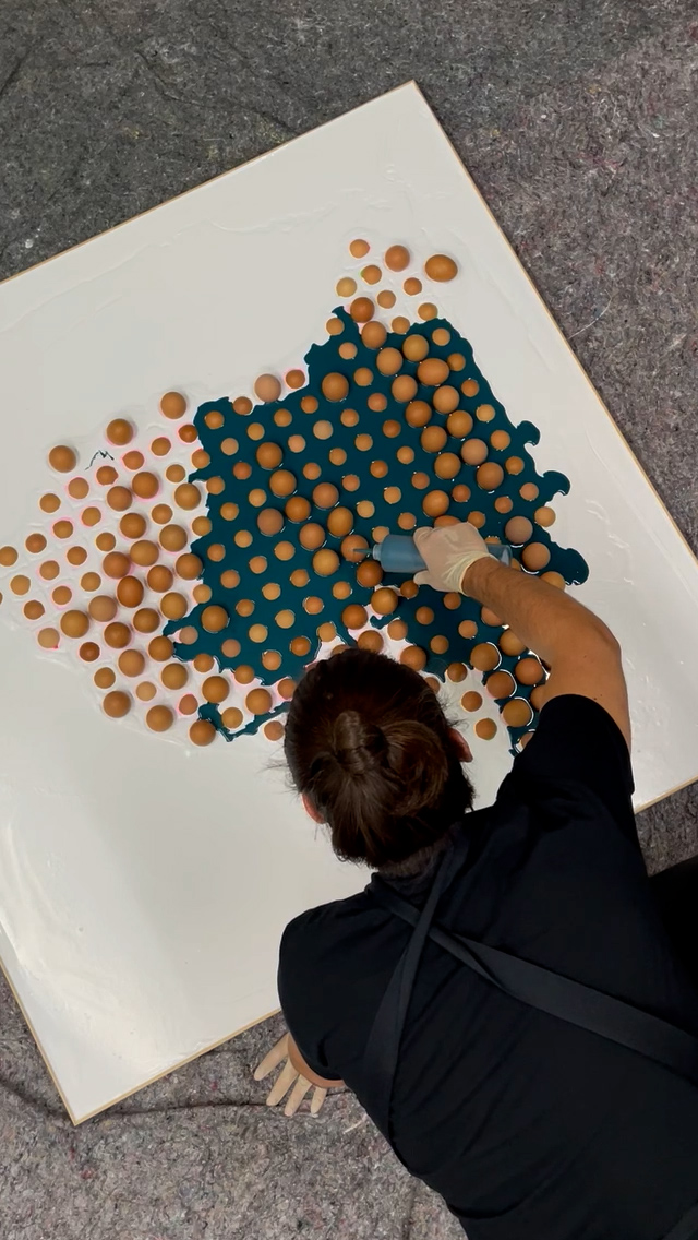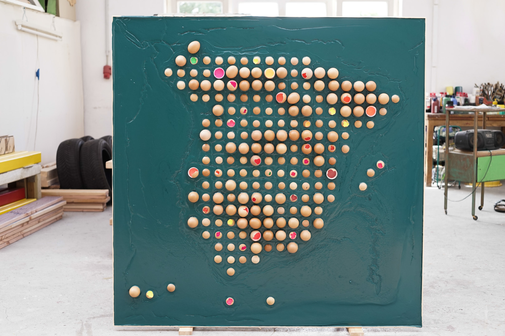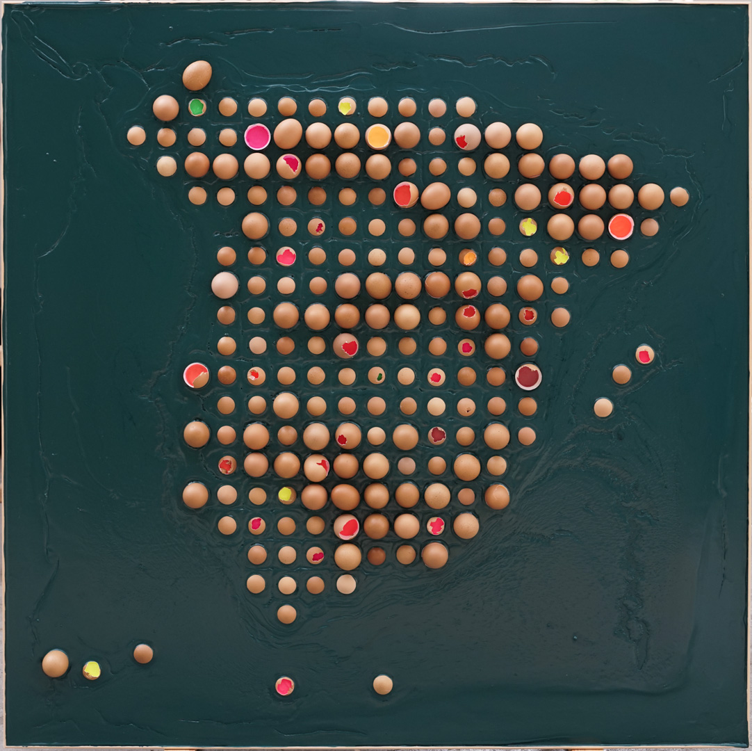 Acrylic paint and eggshells on wood