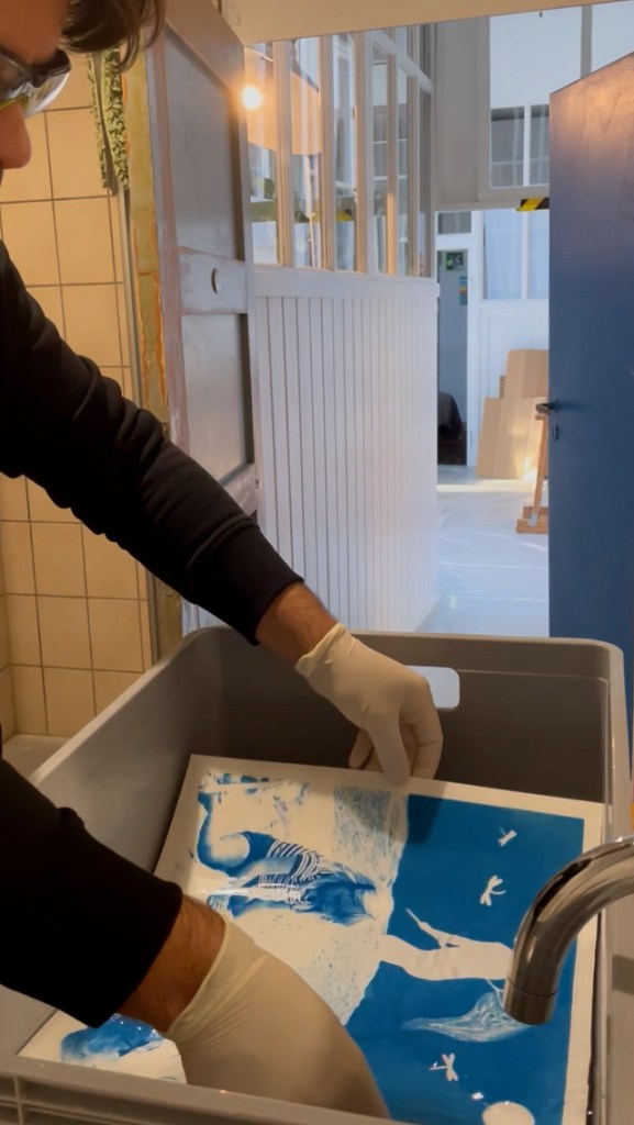 Cyanotype and Linocut ink on Hahnemühle watercolor paper