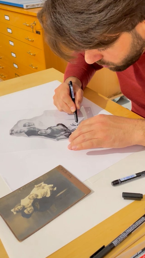 The imagery is based on old photographs found at flea markets—anonymous relics that carry forgotten stories. These photographs are manually altered during the creative process, imbuing each work with an intimate, reinterpreted dimension. Through these fragments of the past, the series evokes a collective sense of nostalgia and estrangement.