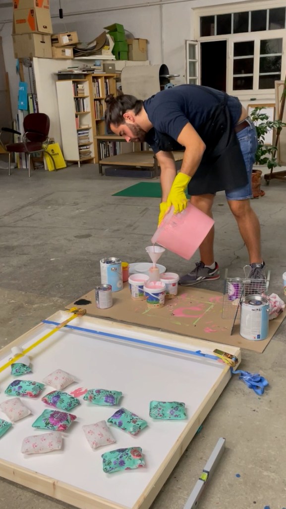 Rice cultivation has traditionally played an important role in Valencia’s agricultural economy. The turquoise cushions are set within an abstract representation of a rice field beneath a reddish-pink evening sky.